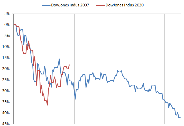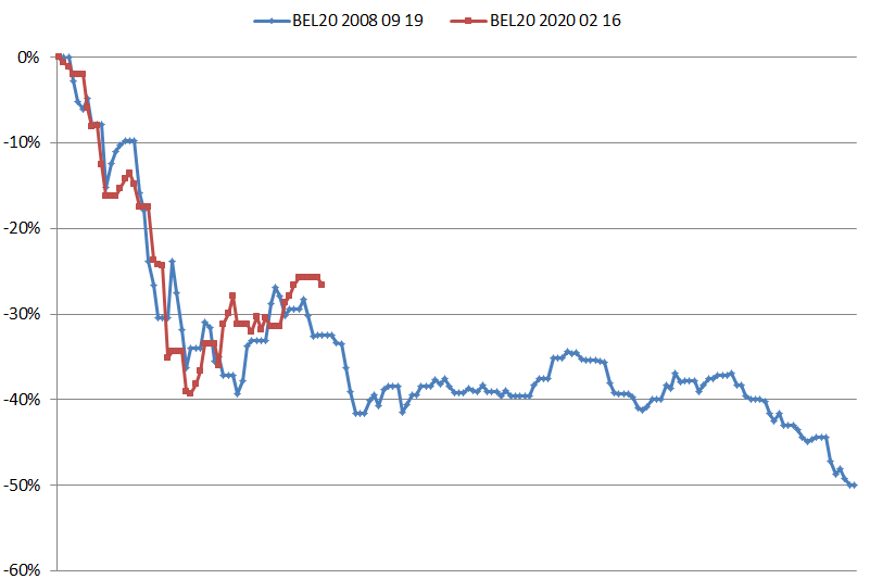 Met een idee dat wij elders vonden, zijn wij de evolutie van de Coronacrisis gaan vergelijken met de Lehman-Brothers-crisis. Omdat België op de wereld maar een speldenprik groot is, heb ik onderaan dit artikel dezelfde vergelijking gemaakt maar nu met de Dow Jones Industrial; da’s al een tikkeltje groter…
