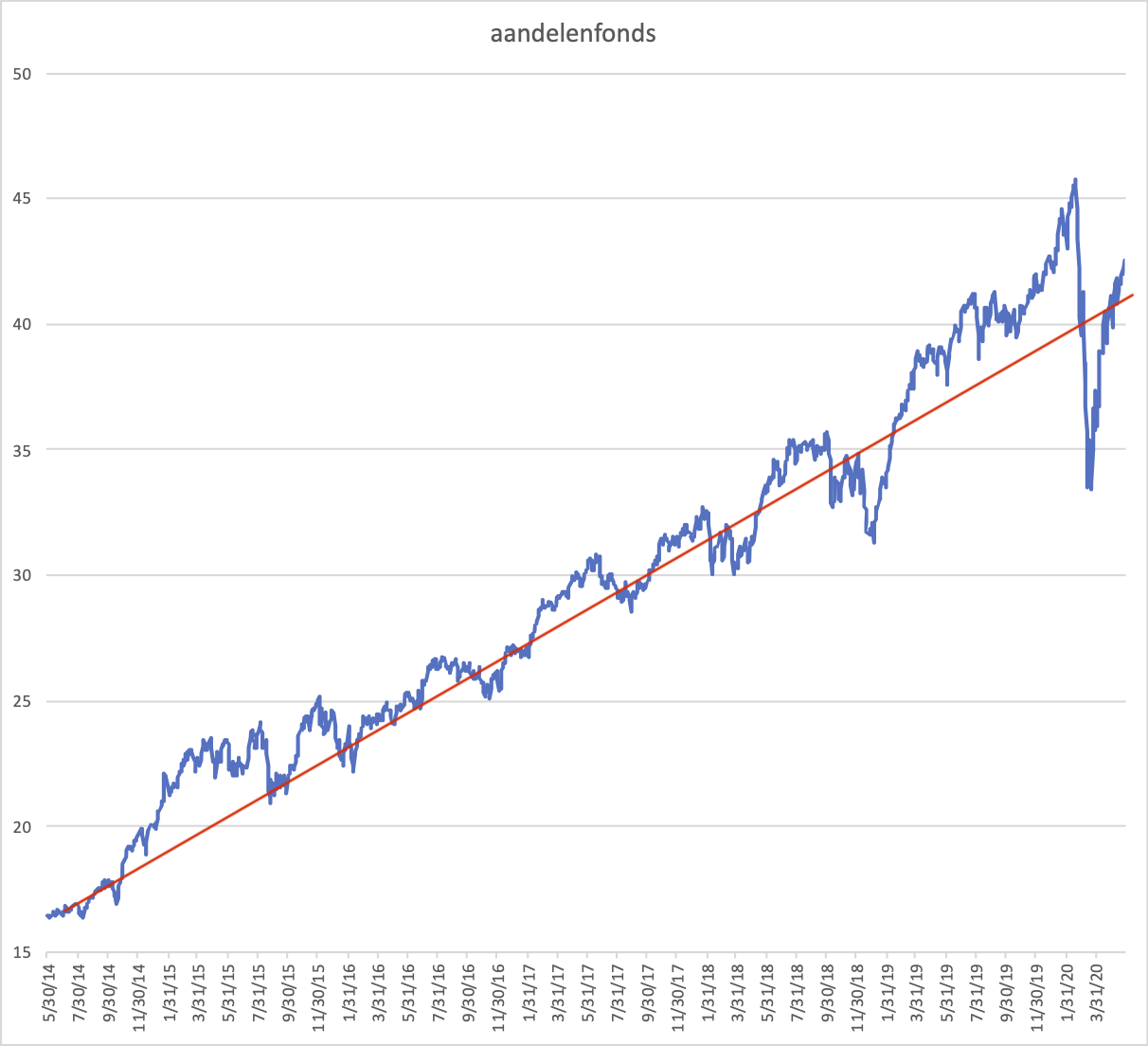 Bekijken we even de koersgrafiek van een doorsnee aandelenfonds over de voorbije jaren.