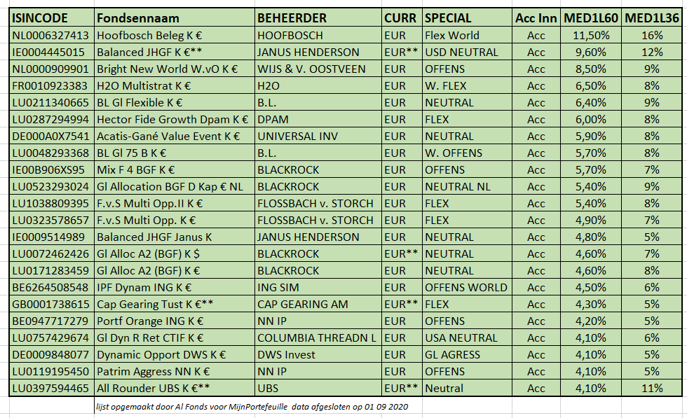 In die meute ben ik gaan bekijken bij welke fondsen men er in slaagde om een meridiaan rendement van de laatste 60 berekeningen (Med1L60 = 30 maanden) van meer dan 4% aangroei te verwezenlijken. Het resultaat is pover: slechts 10%.