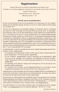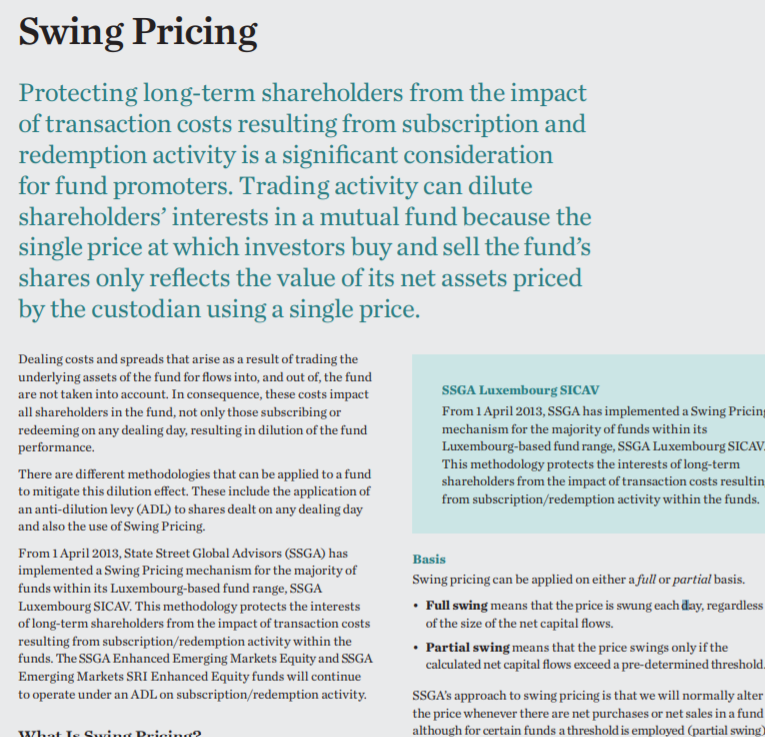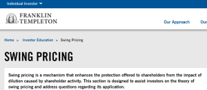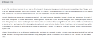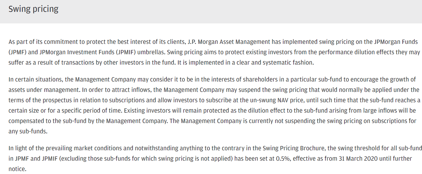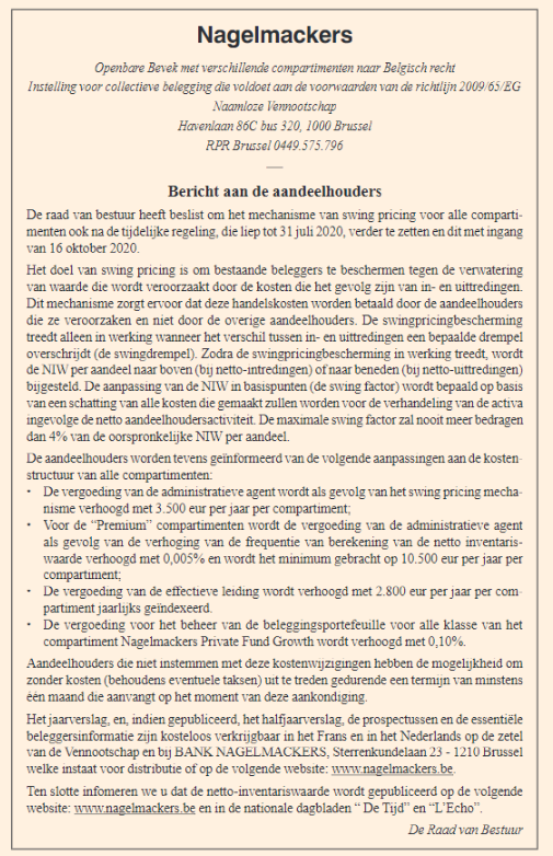 In vrijwel totale stilte werd er door de FSMA een KB uitgebracht op 22/04/2020 dat de fondsenuitgevers de kans gaf (zonder aanpassing van de statuten) bij problemen bij aankoop of verkoop van aandelen of obligaties de NIW met een bepaald percentage te verhogen of te verlagen. Het idee achter deze maatregel is dat de “zittenblijvers” geen nadelen mogen ondervinden van de paniekreacties die leiden tot deze problemen. Deze inkomsten komen ten goede van het fonds en niet van de fondsbeheerders of uitgevers (alhoewel, als men sommige aangepaste statuten leest). Voor die extra kosten die kunnen aangerekend worden, gebruikt men de term “Swing price“.