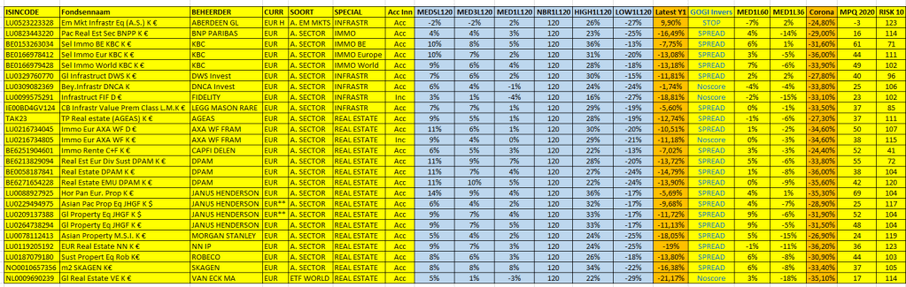 Er werd door een lezer nog een ander Real Estate fonds naar voren geschoven, maar dit was nog te jong. Ik vond er ook nog een in mijn bestand in een andere groep en zelfs nog een ETF. Verder werd er gevraagd om de MPQ en de Risk-factor toe te voegen: is gebeurd. En terwijl ik toch aan de gang was, heb ik er de impact van de Coronacrisis (kolom Corona) ook aan toegevoegd: dit is het verlies (of winst?) tussen 16 02 2020 en 16 03 2020 = verlies op één maand. Nieuwe tabel bijgevoegd helemaal onderaan.