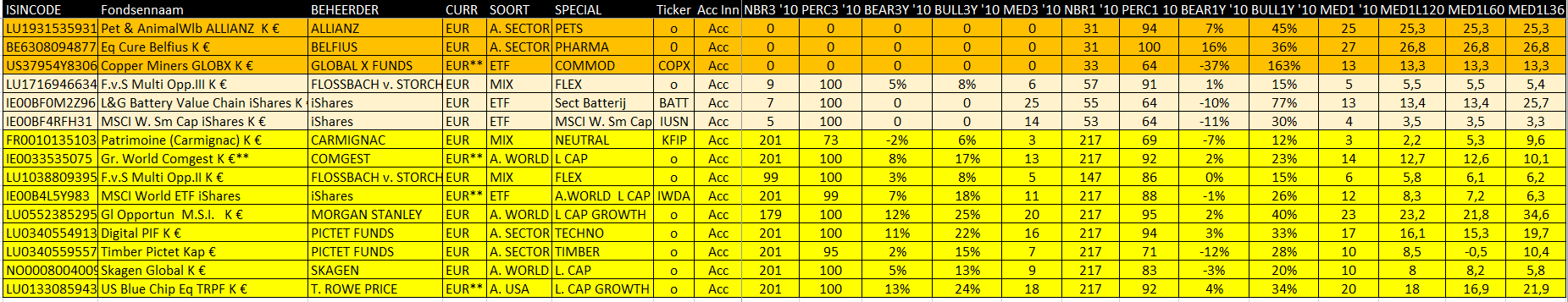 Bij de bovenste 3 zou je uit die cijfers kunnen afleiden dat deze fondsen erg stabiel presteren want al die scores zijn identiek voor elke mediaan. Heb je echter gezien wat die drie bovenste fondsen gemeen hebben ?
