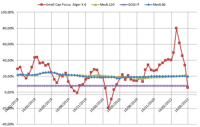 2. Een fonds dat 100% in Amerikaanse small caps investeert. Pesoonlijk heb ik positie in T. Rowe Price Funds SICAV – US Smaller Companies Equity Fund A EUR dat toch minder volatiel is en 180 posities heeft tov dit Alger fonds 54 posities. Dit Alger fonds investeert vooral in technologie en de kleinere technologiewaarden hebben recent wel wat klappen gehad in de VS. Ik zou niet weten waar ik het fonds zou kunnen aankopen, maar ik denk dat dit fonds de komende maanden wel zal herstellen, tenminste toch als de inflatie niet explodeert. Een fonds voor de ervaren durvers voor een kleine positie in de portefeuille.