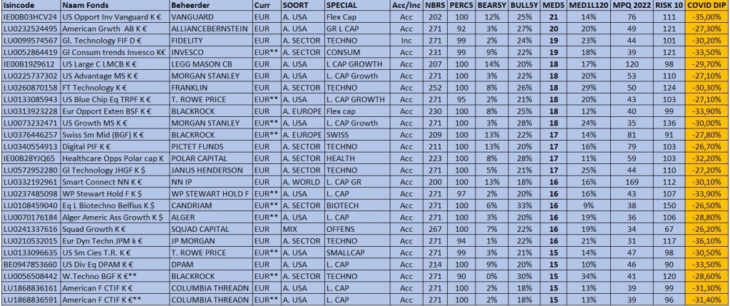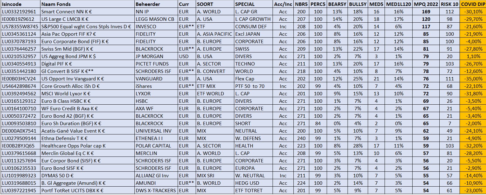 Deze rangschikking kan interessant zijn voor mensen met een defensief beleggingsprofiel alhoewel ik die mensen wel wil waarschuwen: als je echt allergisch bent voor volatiliteit dan moet je voor je de beslissing neemt eens heel goed kijken naar de kolom COVID Dip.