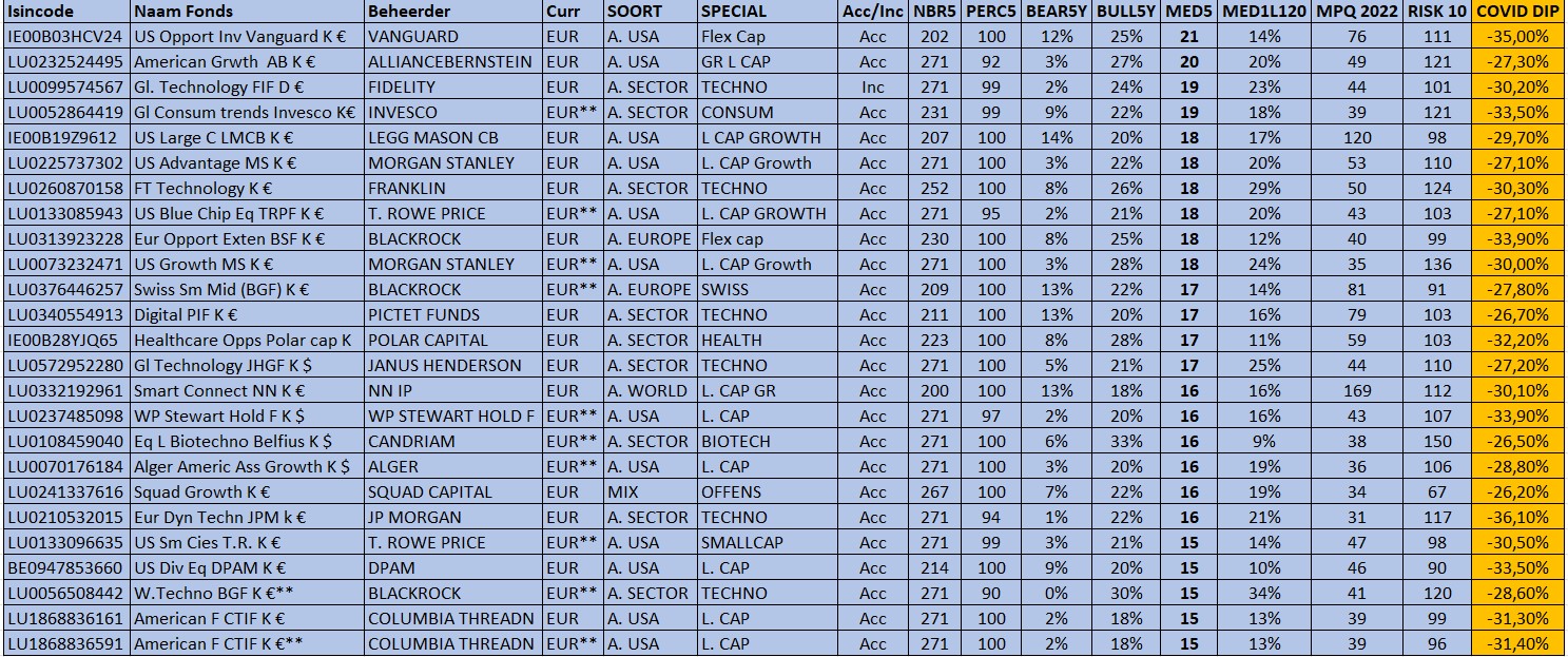 De uitleg van de kolommen is identiek, maar in deze rangschikking houden we zowel rekening van het mediaan rendement als met de volatiliteit (rendement/volatiliteit of Risk).
