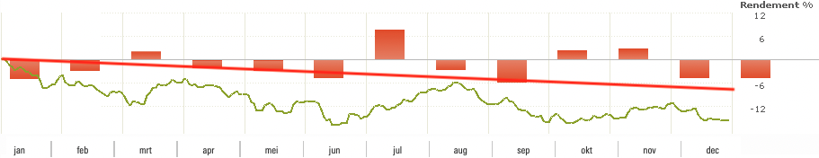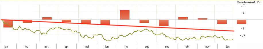 Uit zo’n rendementsgrafieken kan je heel snel zien hoe de portefeuilles de afgelopen jaar zijn geëvolueerd.