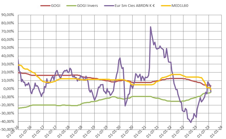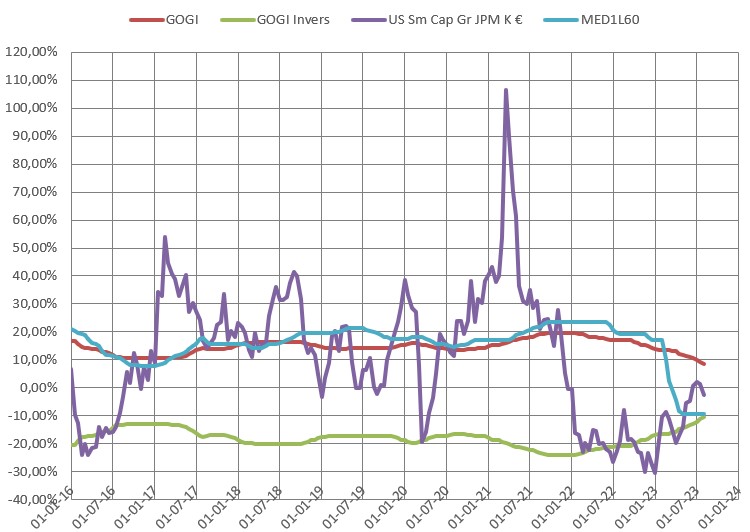 De lijn die wordt aangegeven als GOGI is de MED1L120: in mensentaal het mediaan rendement van de laatste 120 berekende jaarrendementen (een periode van 5 jaar). Je merkt dat het mediaan rendement lange tijd meer dan 10% per jaar was terwijl het rendement vanaf 2023 beneden dat cijfer zakt. Op dit moment heb ik sterk mijn twijfels of ik dit fonds aan jou zou durven aanraden. Als je het zou willen aankopen dan had je dat in het begin van dit jaar moeten doen.