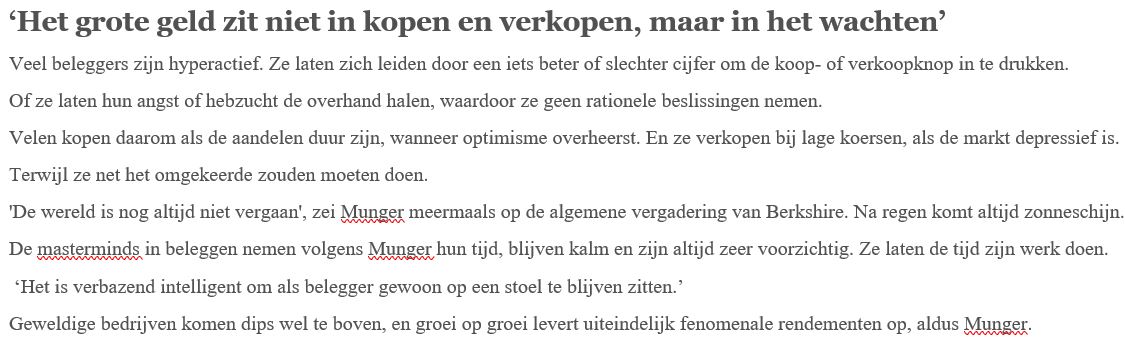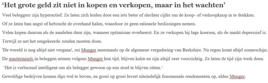 Naar aanleiding van het overlijden van Charlie Munger, de rechterhand van Warren Buffet, publiceerde de Tijd op zaterdag 2 december 2023 de 10 wijsheden van deze superbelegger.