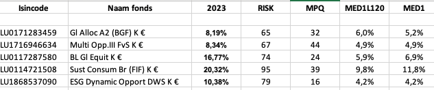 De kolom “2023” toont de prestaties van de fondsen in 2023.