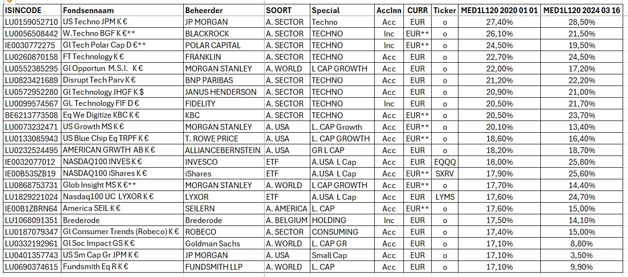 Zo heb ik de MED1L120 van 1 01 2020 en daarvan de 24 hoogst genoteerde weerhouden. Dat wil zeggen dat de helft van de beleggers vanaf 1/1/2014 jaarlijks minder behaalde en de andere helft juist meer. Bij de meeste schommelde hun jaarlijks rendement rond dat cijfer. In de volgende kolom de MED1L120 op 16 03 2024. Zoals je kan zien blijven de goede presteerders ook nu nog bij de beste uit de groep.