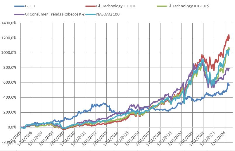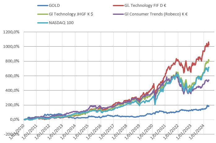 Ik heb al zo dikwijls aangegeven dat men dient op te letten als men je grafieken voorlegt die starten of eindigen op een bepaalde datum. Je kan er vergif op innemen dat het fonds (of hier goud in dit geval) er het beste uit komt.