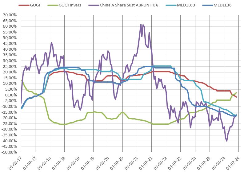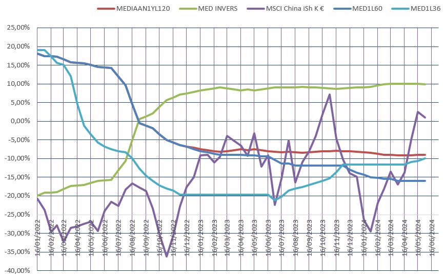 De start van deze grafiek nemen we met een korrel zout omdat ik onvoldoende historiek kon terugvinden om de MED1Yl120 exact met 120 noteringen te beginnen. Maar uiteindelijk dezelfde bemerking: de Inverse MED1YL120 wordt positief en dat betekent niet meer of niet minder dan dat je de verliezen opstapelt. Met deze tracker diversifiëren trekt je rendement lager.