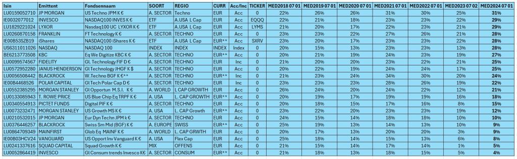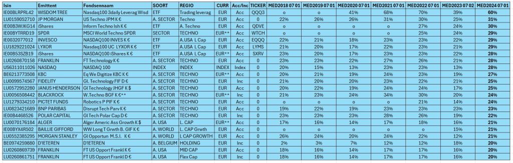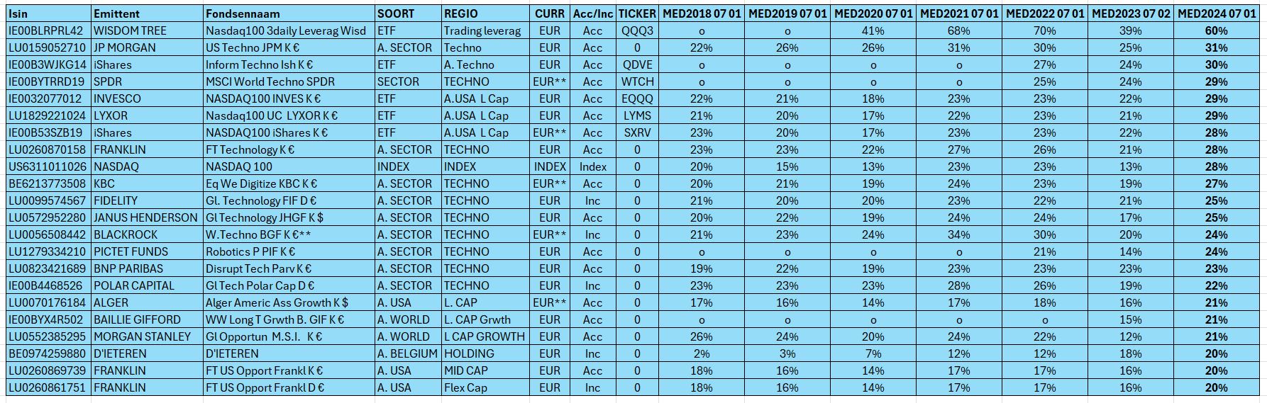 Dit zijn de fondsen die de laatste 5 jaar een mediaan jaarlijks rendement genereerden van meer dan 20% op 1 07 2018. Valt het jou ook op hoe weinig ETF’s daarbij zitten. Nochtans zijn er velen die bankfondsen gewoon afzweren. Weer laat de kudde zich misleiden door holle slogans over kosten ?