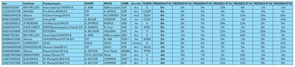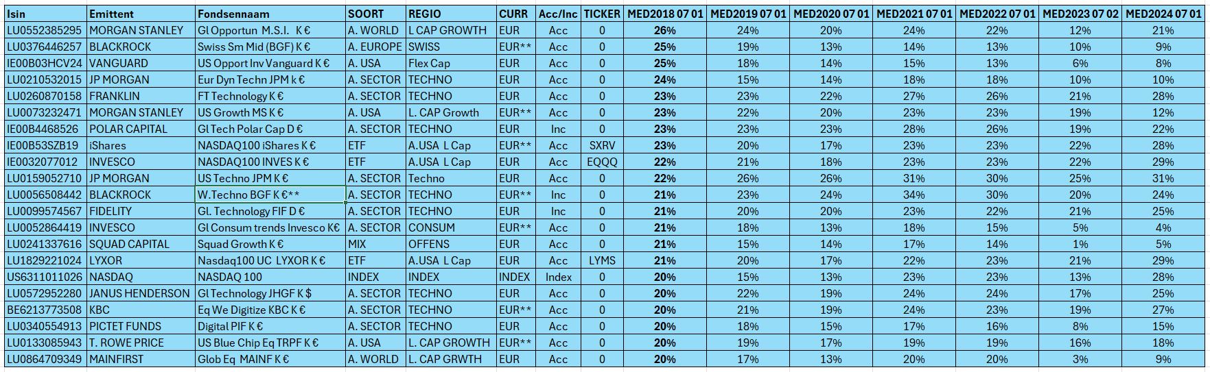 Ik ben gaan berekenen wat de MED1YL120) was op 1 07 2018: dat betekent de mediaan van alle resultaten tussen 1 07 2013 en 1 07 2018 en dat voor een periode die eigenlijk start op 1 07 2012 want je hebt pas een jaarresultaat na een eerste volledig jaar. Komt er aldus op neer dat je hier geen fondsen of trackers gaat vinden die op een latere datum werden opgestart.