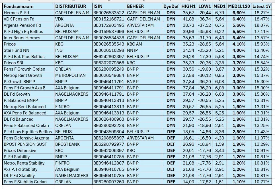 De kolom MED1 geeft het mediaan jaarresultaat sedert de start van het fonds. Terwijl Med1L120 het mediaan jaarresultaat weergeeft van de laatste 5 jaar. Je kan zo merken dat de resultaten de laatste jaren nog verzwakken.