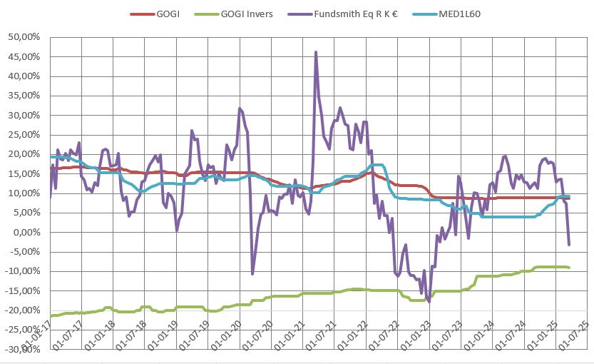 Je merkt duidelijk dat het in verliesmodus verdwijnt want de lijn van de GOGI Invers situeert zich boven de GOGI-lijn. Quasi een zekerheid dat je geld gaat veliezen als je het nu aankoopt.