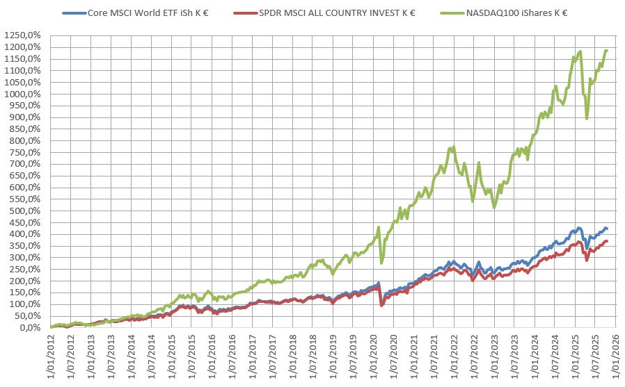 Voor IWDA en SWRD zie je praktisch maar 1 lijn omdat beide trackers mekaar qua meerwaarde spiegelen en alzo overlappen. Ikzelf zou geen van beide de explicite voorkeur geven maar eerder, indien mogelijk, opteren voor de beide als een vorm van diversificatie: je weet maar nooit.